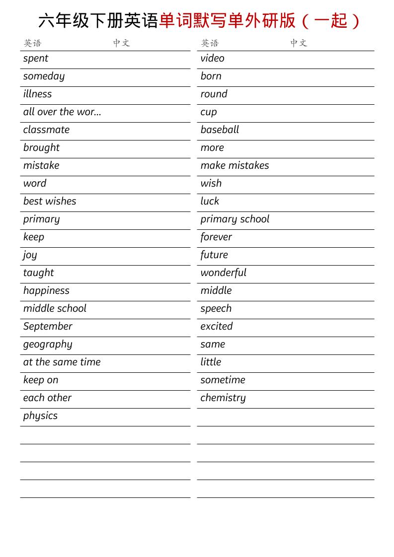 六年级下英语全册单词默写单《外研版(一起)》青禾2026年4月8日更新关注私信5005 ——预览已结束,还剩2页未读——您已获得此文档下载权限,请点击底部下载完整文档 六年级下英语全册单词默写单《外研版(一起)》此内容为付费资源,请付费后查看🌱17.2资源会员免费社区会员免费立即购买您当前未登录!建议登陆后购买,可保存购买订单3457199952遇到资源链接失效请联系站长!付费资源© 版权声明 版权声明 1 本站名称: 青禾学社 2 本站网址:vip.72ww.cn 3 本站一切资源不代表本站立场,并不代表本站赞同其观点和对其真实性负责。 4 本站附件资源、教程等内容如因时效原因失效或不可用,请联系站长及时更新。 5 本站一律禁止以任何方式发布或转载任何违法的相关信息,访客发现请向站长举报。 6 本站文章部分内容可能来源于网络,仅供大家学习与参考,如有侵权,请联系站长进行删除处理。 THE END六年级英语 喜欢就支持一下吧 分享QQ空间微博QQ好友海报分享复制链接收藏